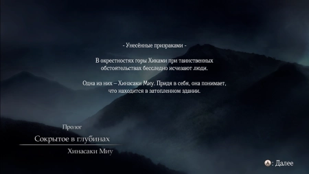 Сюжет: Гора Хиками когда-то считалась священной. Там процветала религия, посвященная воде. Ходили слухи о страшных происшествиях и загадочных явлениях. Сюжет игры рассказывает о трех героях: Юри Кодзукате, Мю Хинасаки и Рэне Ходзё. Они отправляются на гору, чтобы раскрыть ее тайны.